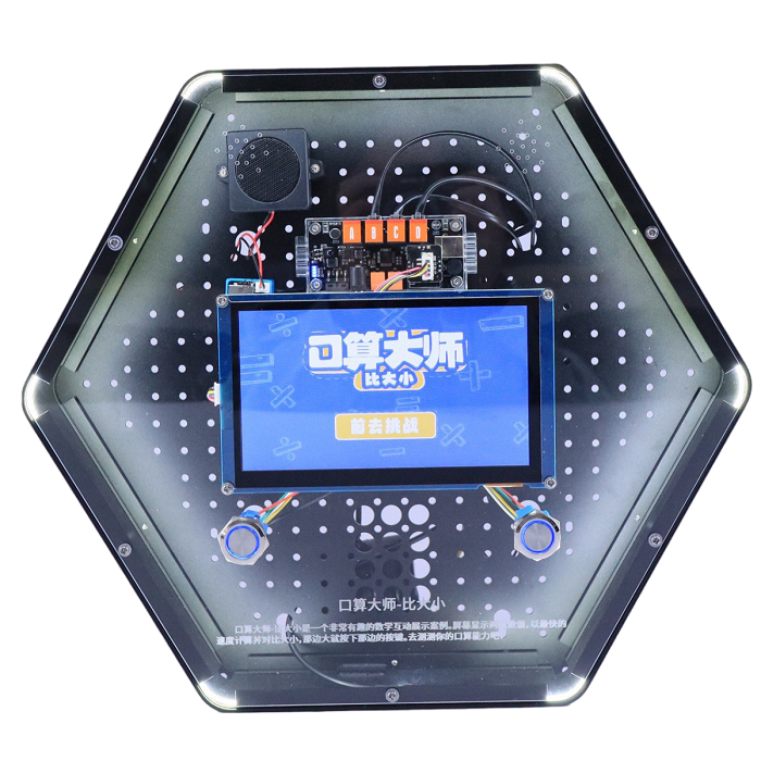 Интерактивный модуль для оформления зон рекреации, кабинетов, IT-полигона, библиотеки, медиа зоны. Модуль позволяет изучить технологии написания и управления программами, применение сенсорных экранов, технология распознавания изображений, кнопочный ввод и функции голосового вывода. Модуль выполнен в форме шестиугольной призмы с интерактивным наполнением.