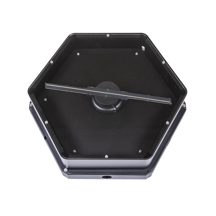 Интерактивный модуль для оформления зон рекреации, кабинетов, IT-полигона, библиотеки, медиа зоны. Модуль демонстрирукт эффект трехмерной голографической визуализации. Выполнен в форме шестиугольной призмы с интерактивным наполнением.