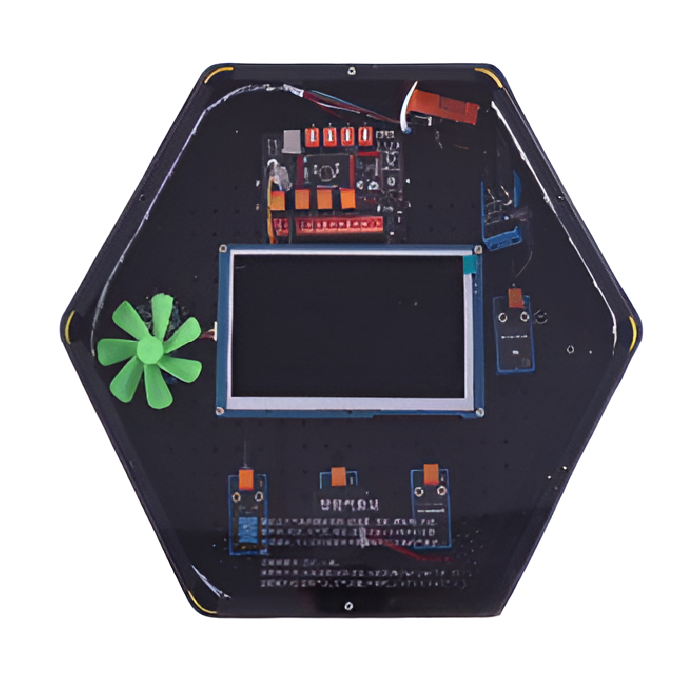 Интерактивный модуль для оформления зон рекреации, кабинетов, IT-полигона, библиотеки, медиа зоны. Модуль моделирует и отображает соответствующие метеорологические параметры, такие как температура, влажность, содержание твердых частиц, освещенность, ультрафиолетовые лучи, скорость ветра, атмосферное давление и шум. Оснащенный модулем распознавания речи и модулем синтеза речи, он может распознавать голосовые команды и транслировать измеренные метеорологические параметры. Модуль выполнен в форме шестиугольной призмы с интерактивным наполнением.