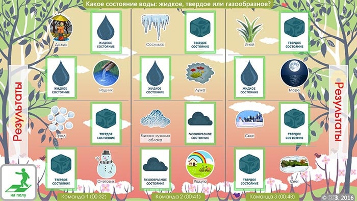 После запуска программы на полу появляются изображения по выбранной теме, а дети должны найти правильные ответы, встав на них, либо положив игрушку. Есть задания, в которых предлагается раскладывать карточки с символьными изображениями, например, распределять месяцы по временам года, зимующих и перелетных птиц и т. д. В игровых заданиях могут участвовать одновременно несколько учащихся, вплоть до всего класса.
