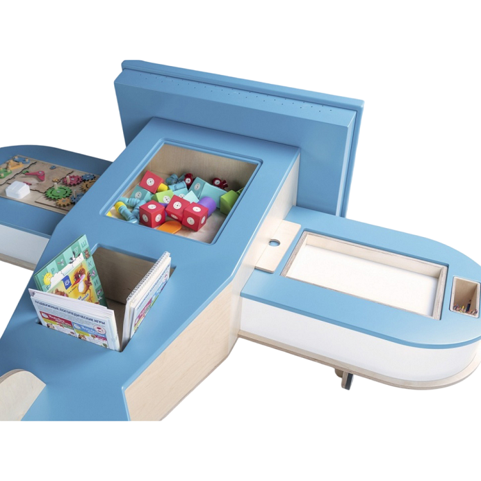 На правом крыле самолёта расположен световой стол для рисования песком. Песочная панель закрывается крышкой, становясь полноценной рабочей зоной для детей.