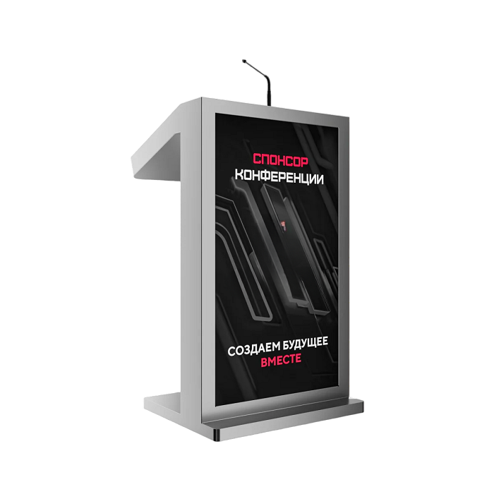 Мультимедийное решение, которое позволяет не только ярко выступить на большую аудиторию, с отображением презентационного материала, но и эффектно продемонстрировать рекламную информацию о компании, предлагаемых товарах / услугах, спикере, на большом внешнем дисплее трибуны. Модель Double 21,5" оснащена мощным микрофоном, сенсорным дисплеем для спикера, а также большим внешним дисплеем для рекламного контента и набором разъемов для подключения дополнительной техники. Такая трибуна станет прекрасным помощником на конференциях, выставках, спортивных мероприятиях или других мероприятиях, где требуется визуальная поддержка презентаций и общение с аудиторией.