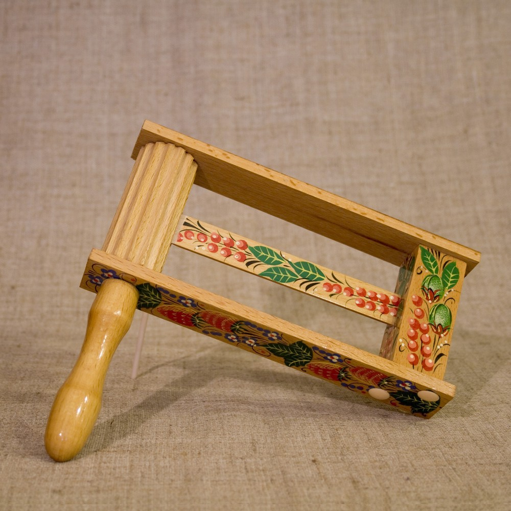 Представляет собой зубчатый барабан, совмещенный с ручкой. На зубчатом барабане вверху и внизу крепятся пластины, соединенные прямоугольной бобышкой. В бобышку вклеена деревянная пластина, которая упирается в барабан. При вращении барабана пластина перескакивает по зубцам и издает громкие щелчки. Вращение может осуществляться в любую сторону.