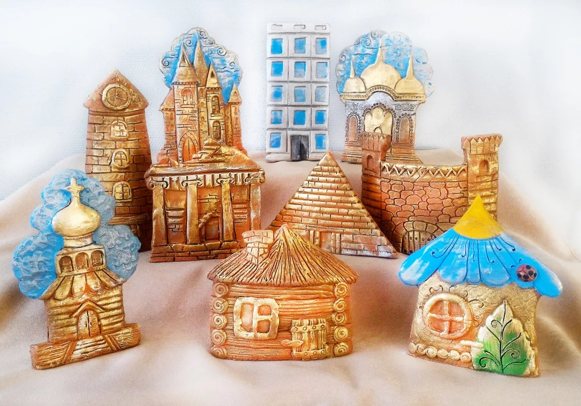 10 стилизованных глиняных фигурок: старинное здание , замок, башня, крепость, пирамида, храм, церковь, современное здание, деревенская изба, сказочный дом.