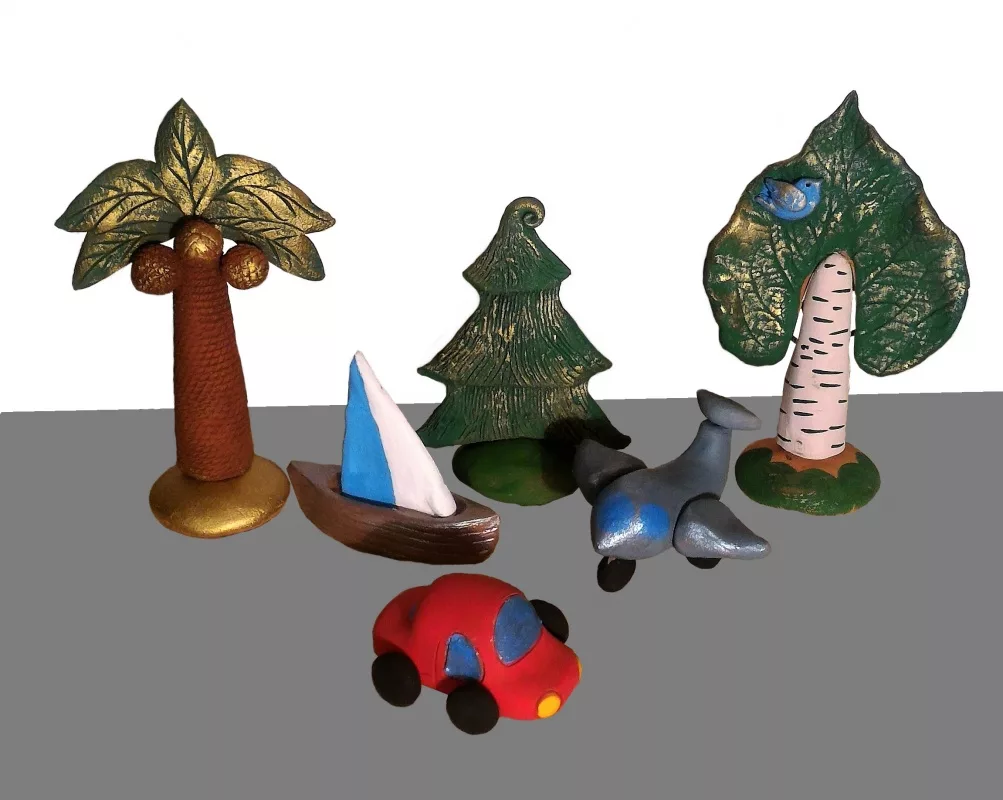 Авторские глиняные фигурки. В наборе 6 предметов: берёза, ёлка, пальма, машинка, кораблик, самолёт.