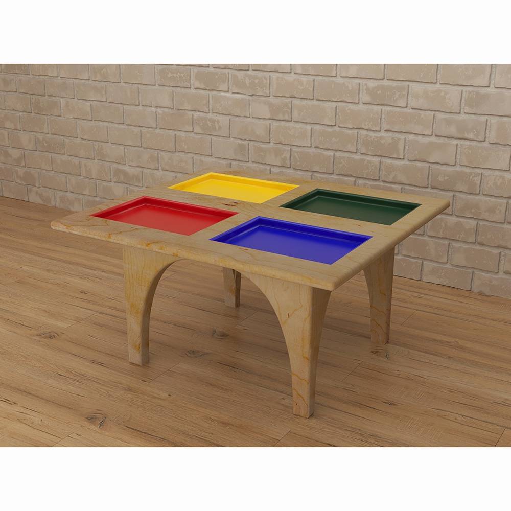 Игровой стол для занятий сенсорной интеграцией 4 цвета имеет лаконичный дизайн – основание имеет натуральный цвет древесины, а игровые пространства-углубления окрашены каждое в свой цвет (красный, жёлтый, синий и зелёный). Благодаря высокому полезному потенциалу детский игровой стол можно считать необходимым элементом оснащения пространства для занятий с детьми – его внешний вид и разнообразное применение поможет превратить обычное занятие в весёлую игру. Для чего нужно: игровой стол для занятий сенсорной интеграцией предназначен для групповых и индивидуальных занятий с детьми дошкольного и младшего школьного возраста в детских садах и центрах раннего развития.