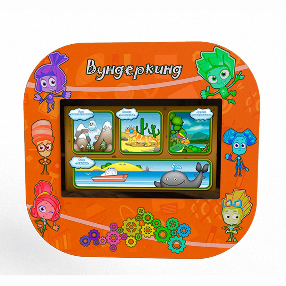 Вундеркинд представляет собой настенную панель, оформленную в стиле мультфильма «Фиксики», с сенсорным экраном диагональю 23,8 дюйма и разрешением 1920х1080 px. За счет установленной Multi Touch системы (поддержка 10 касаний) занятия за оборудованием проводятся как индивидуально, так и для группы.