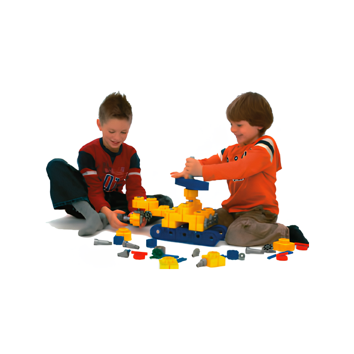 Набор пластмассовых элементов со специальными конструктивными возможностями соединения включает кирпичики, шестерни, гусеницы. Можно собрать разнообразные транспортные средства, здания, мебель, животных и многое другое.