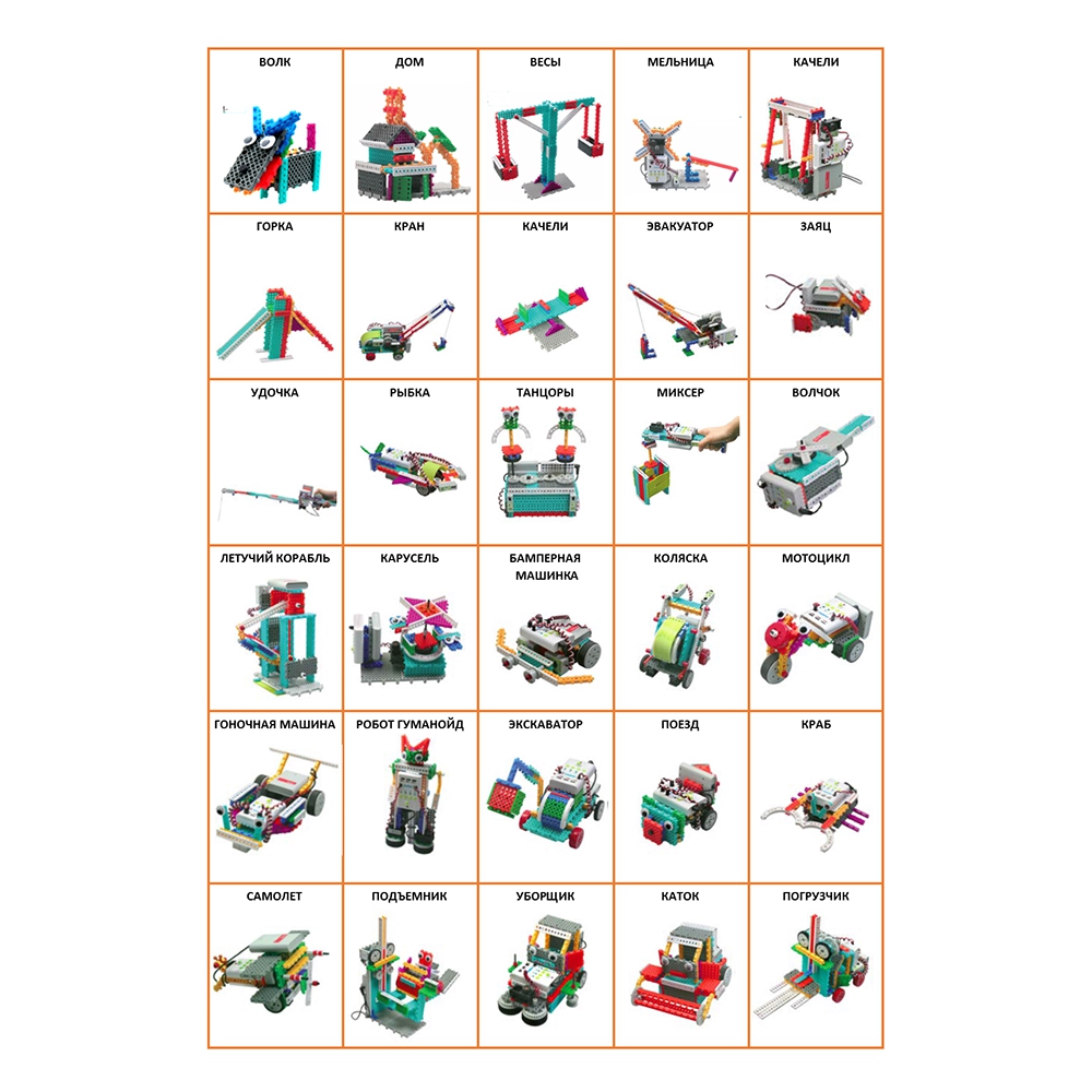 Моделируем: пляжное кресло-трансформер, геометрические формы, подставку для книг, волка, дачный домик, весы, требушет, балансирующие качели, горку. Собираем робота: рулетку, робота-мельницу, робота-качели, робота-подъемный кран, робота-автокран, робота-лифт, робота-кролика, робота-электроудочку, робота-рыбу, робота-танцующую куклу, робота-блендер, робота-топспин, робота-карусель лодочки, робота-карусель, робота-автомобильчик с бампером, робота-детскую коляску,робота-мотоцикл, робота-гоночный мотоцикл, танцующего робота, робота-экскаватор, робота-поезд, робота-краба, робота-биплан, робота-подъемник для автомобилей, робота-машину уборщик, робота-автомобиль-каток,робота-автопогрузчик.