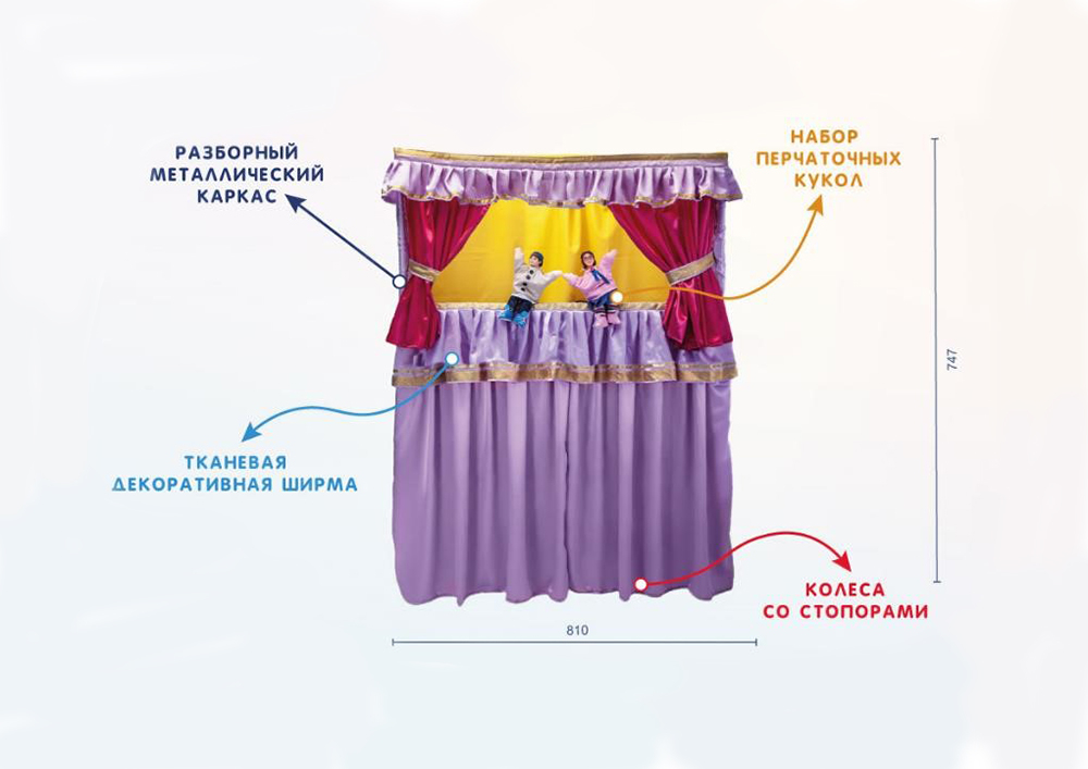 Кукольный театр «В гостях у сказки» был разработан, скомплектован и произведен методистами. Главным предназначением кукольного театра является организация театральных постановок при помощи перчаточных кукол.