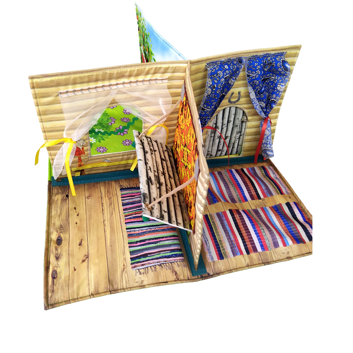 Разделена на 4 зоны: кухня с печкой, комната с окошком и полатями, садик перед домом с лужайкой и забором, лес с деревьями. Все это дополнено навесными элементами (тучка, птичка, бабочка, куст, цветочек) для более интересной игры.