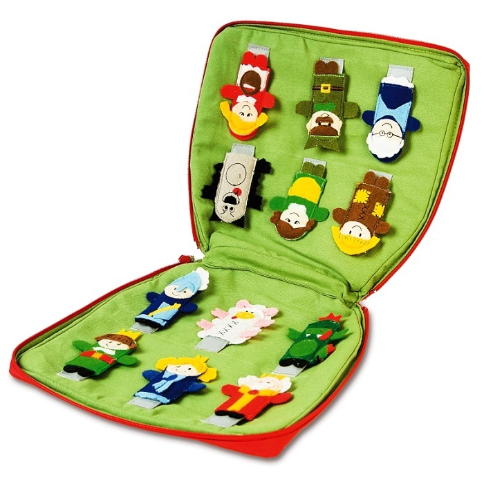 Набор из 12 марионеток в удобной сумке-домике, с ручкой для переноски, позволяющие также подвесить ее в выбранном месте. Ребенок легко наденет куклу на палец и оживит персонажей, шевеля рукой. Благодаря их небольшим размерам, один ребенок может играть одновременно несколькими персонажами, и в одиночку играть весь спектакль или пригласить для развлечения друзей и совместно представить сказку.