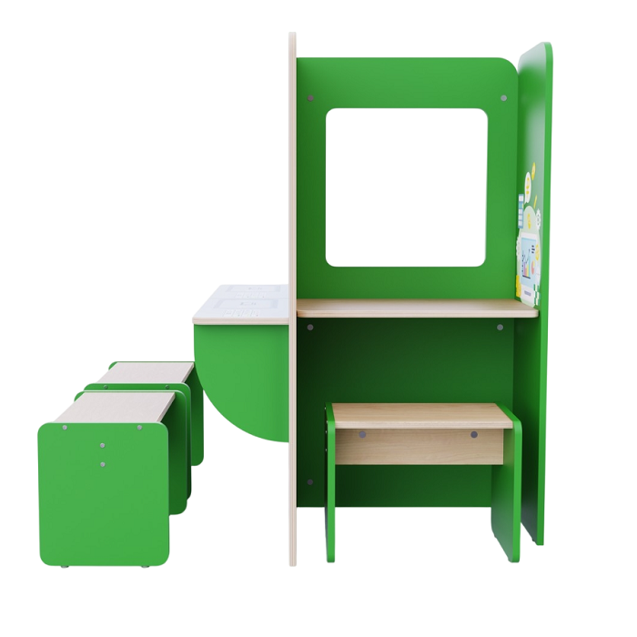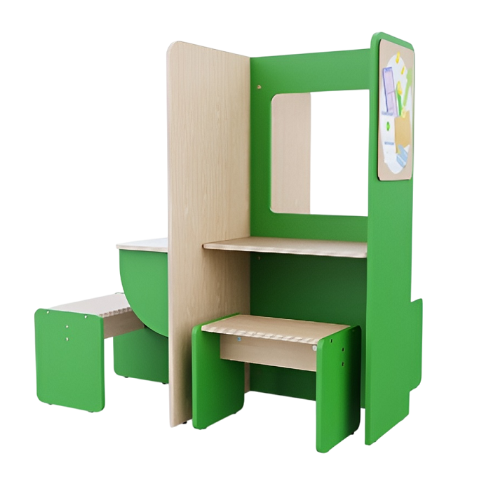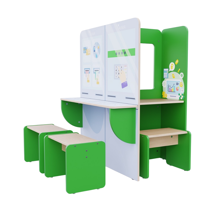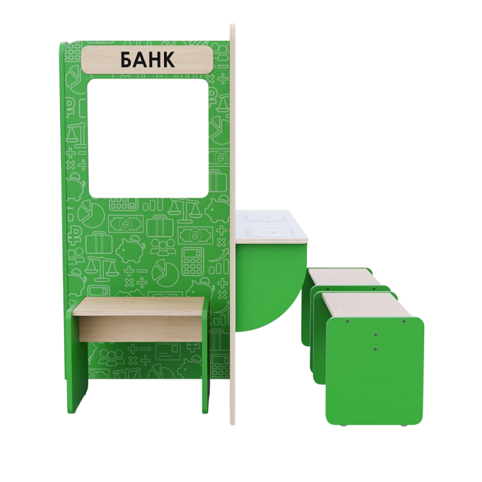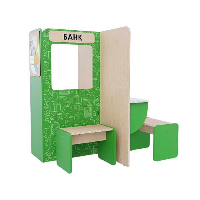 Пространство для сюжетно-ролевых игр в детских садах и дошкольных учреждениях, чтобы дети могли в приближенном к реальности пространстве попробовать себя в роли сотрудников и клиентов банка.