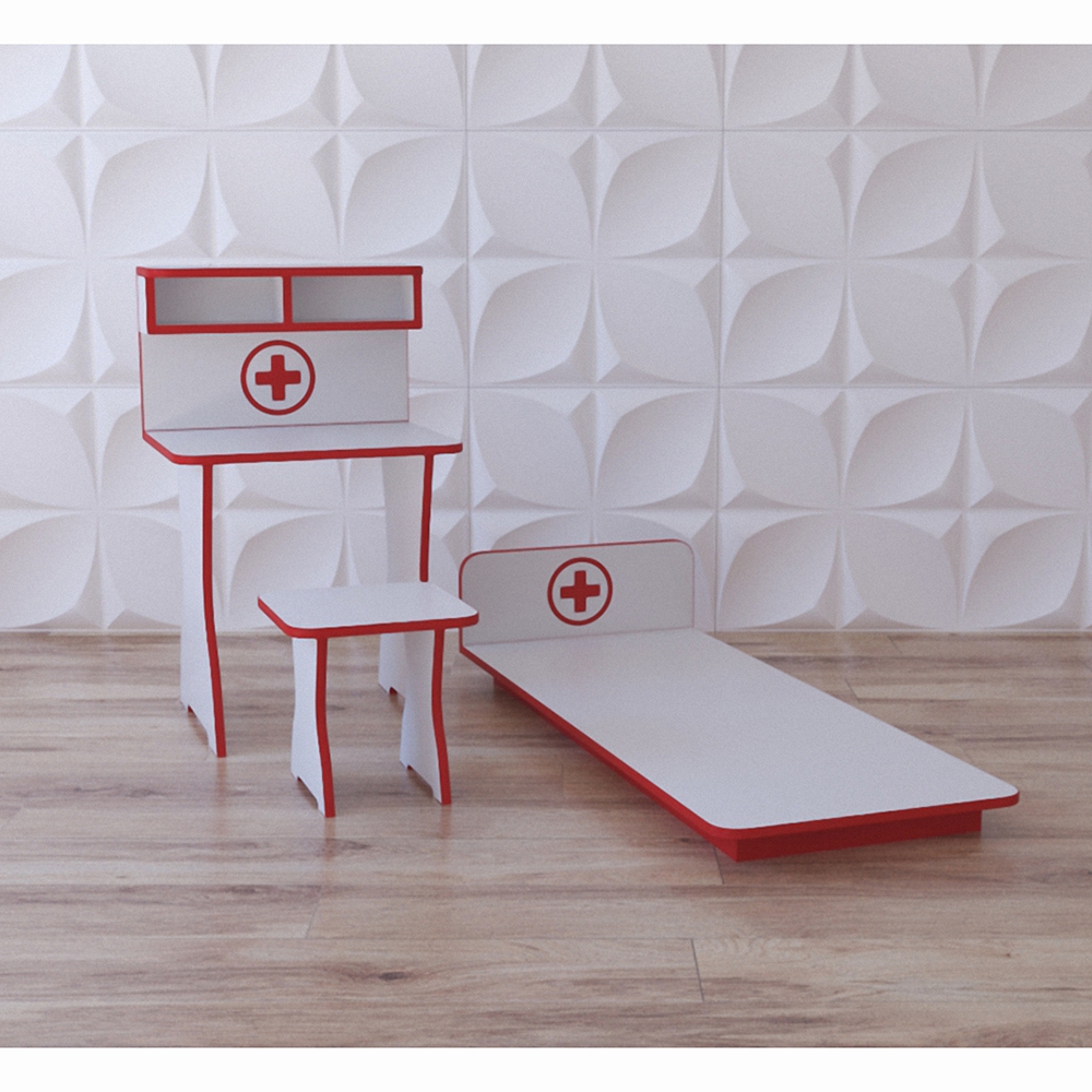 Игровое тематическое оборудование для сюжетно-ролевых игр “Я - доктор” предназначено для детей от 1 года. Лаконичное исполнение делает его незаменимым для весёлых сюжетных детских игр. Особенно такой домик оценят по достоинству ребята, которые мечтают стать медицинскими в будущем. Игровой “Я - доктор” включает в состав столик с полочками, стул и кушетку, все предметы окрашены в бело-красные цвета. Игра станет ещё более наполненной, если комплект домику составит игровой модуль из нашего каталога, который называется детский игровой домик “Поликлиника”.