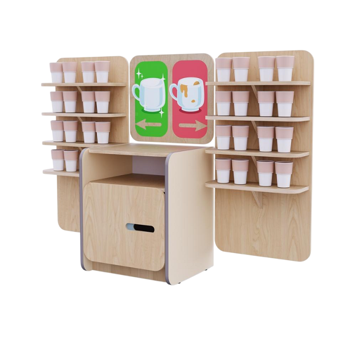Набор для организации питьевого режима в детском саду: тумба для чайника, две навесные полки для кружек и табличка «Чистые и грязные кружки».