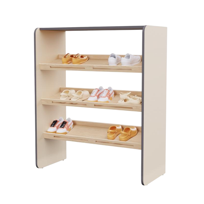 Система хранения детской уличной обуви. Дизайн шкафа с наклонными полками обеспечивает лёгкий доступ и видимость обуви, а бортики на полках предотвращают их падение. Предмет из коллекции мебели «НЕГА».