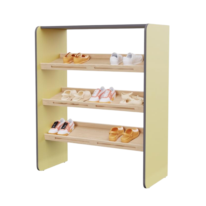 Система хранения детской уличной обуви. Дизайн шкафа с наклонными полками обеспечивает лёгкий доступ и видимость обуви, а бортики на полках предотвращают их падение. Предмет из коллекции мебели «НЕГА».
