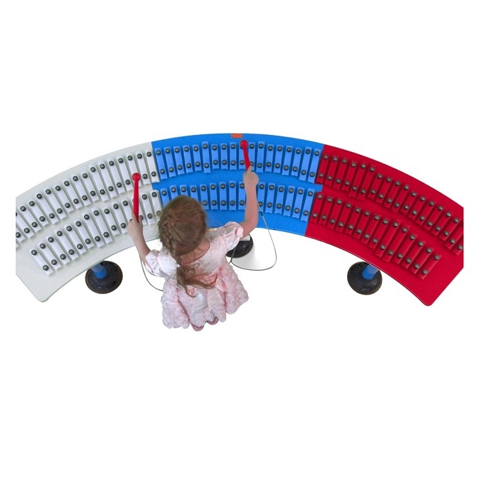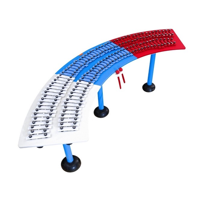 Металлофон в цветах российского триколора, нотные пластины музыкального инструмента расположены так, что любой пользователь может сыграть гимн России без предварительной музыкальной подготовки и пропеть его, пользуясь текстом, нанесенным на клавиши.