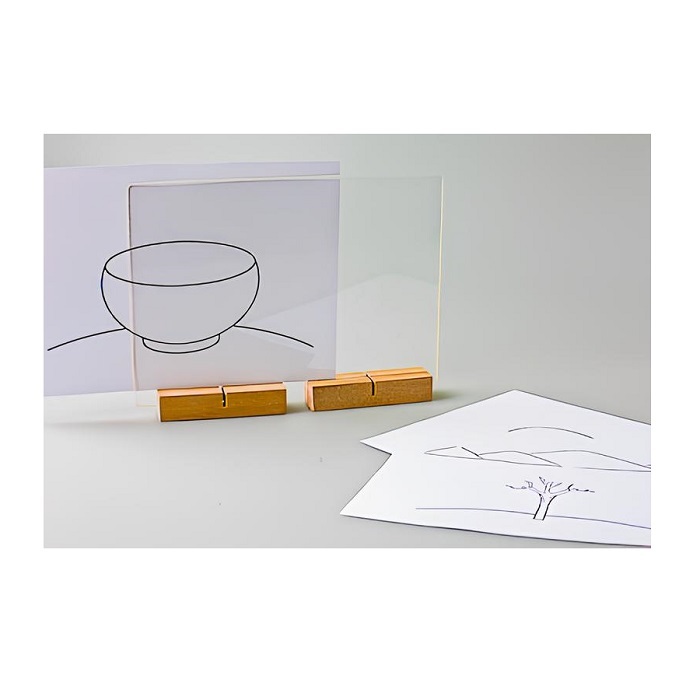 Рабочая поверхность мольберта изготовлена из акрилового стекла и вставляется в подставки из натурального бука. Подставки позволяют его использовать в вертикальном, горизонтальном положении, а также параллельно рабочей поверхности стола.