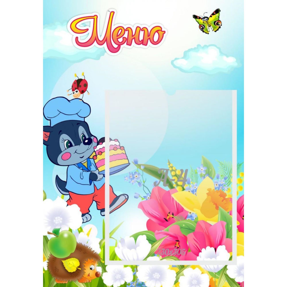 Стенд "Меню Волчок" украшен изображением маленького волчонка с тортиком и в поварском колпаке, а также яркими цветами. Фоном служит голубое летнее небо с легкими облаками. Такой дизайн обязательно привлечет внимание и поднимет настроение и детям и взрослым. В удобном кармане формата А4 можно разместить меню на сегодняшний день. Вся информация при необходимости легко обновляется.