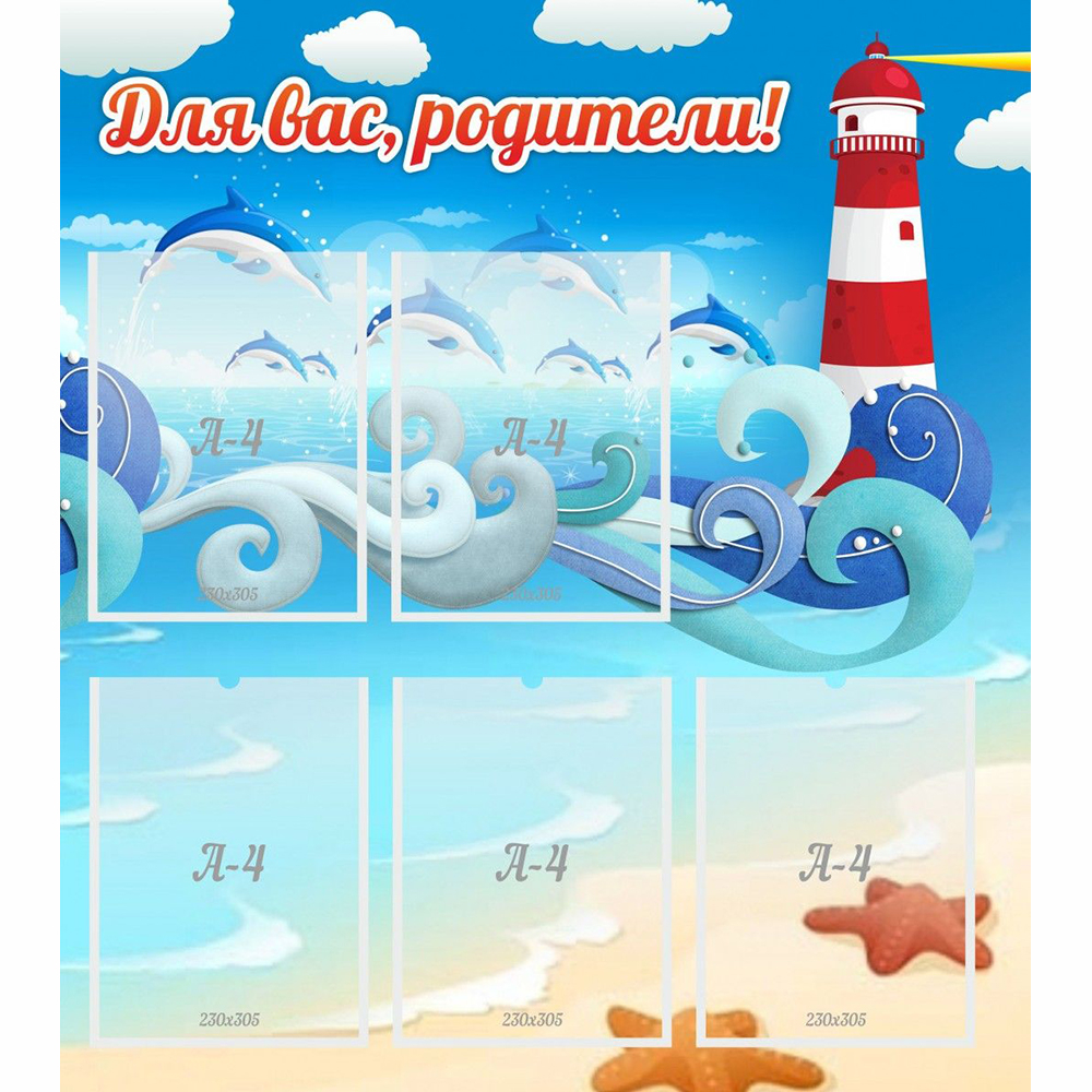 Воспитатели обязательно оценят удобство стенда "Для вас родители!", а насыщенные изображения маяка, морских звёзд и дельфинов обязательно порадуют не только ребят, но и их родителей!