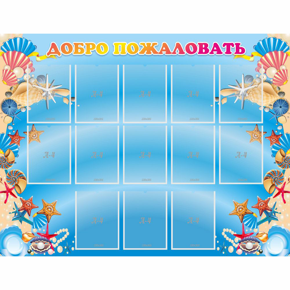 Темно-голубой фон морских глубин красиво оттеняет многочисленные карманы формата А4, в которых можно разместить фотографии детей и воспитателей, важные объявления, плакаты, списки групп, различные информационные листы о жизни детского сада. Вырез в верхнем краю карманов позволяет легко обновлять размещенную информацию. Картинка по краям дополняется красочными обитателями подводных глубин, которые обязательно привлекут внимание ребенка.