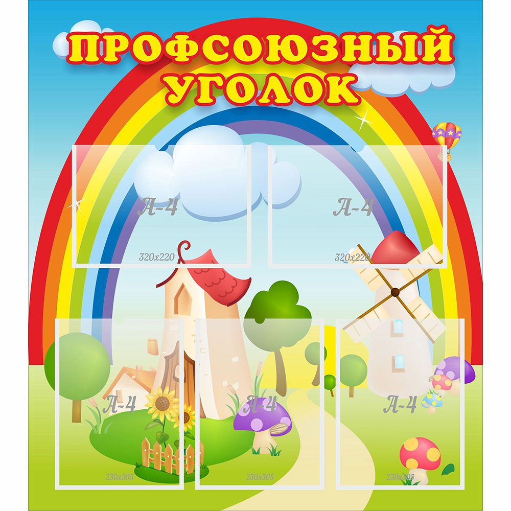 Пополнить информационную составляющую интерьера детского сада позволяет стенд «Профсоюзный уголок». Универсальность стенда заключается в том, что на нём закреплены пять карманов – каждый предназначен для фиксации листа А4.