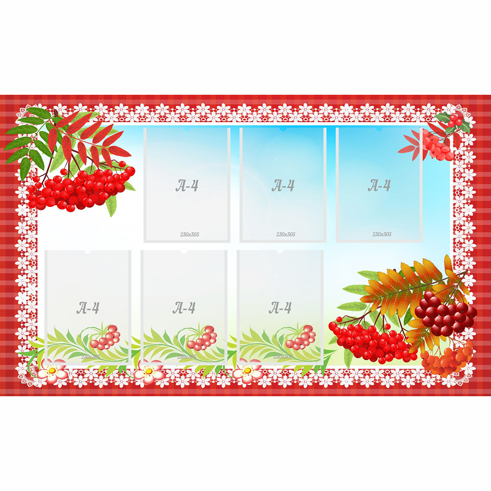 Что делать, если необходимо срочно вывесить важную информацию, а подходящего тематического стенда нет в наличии? Решить эту задачу поможет стенд без названия. Украшенный яркими гроздьями рябины и окантовкой того же цвета, он обязательно привлечёт внимание детей и их родителей, а шесть карманов формата А4 позволят разместить всё самое необходимое. В то же время, заменить информационные материалы не составит труда.