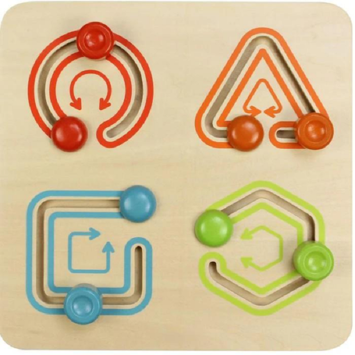Панель для развития мелкой моторики в 4 различных геометрических формах. Маленькие ручки будут держать деревянные блоки и перемещать их по дорожкам, следуя направлениям стрелок.
