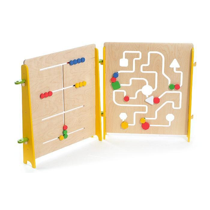 Панель игровой стены с желобом сложного рисунка, в который вставлены деревянные геометрические фигуры разных цветов.