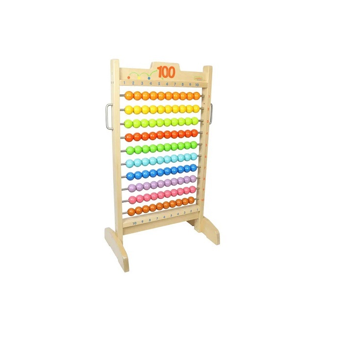 Счеты изготовлены из дерева и стали, состоят из 10 рядов разноцветных шаров на горизонтальных металлических направляющих, которые вмонтированы в 2 вертикальных деревянных бруска. Общее количество шаров 100 шт. В верхней части счётов по горизонтали и сбоку по вертикали изображен числовой ряд от 1 до 10, в нижней части – числовой ряд от 10 до 1.